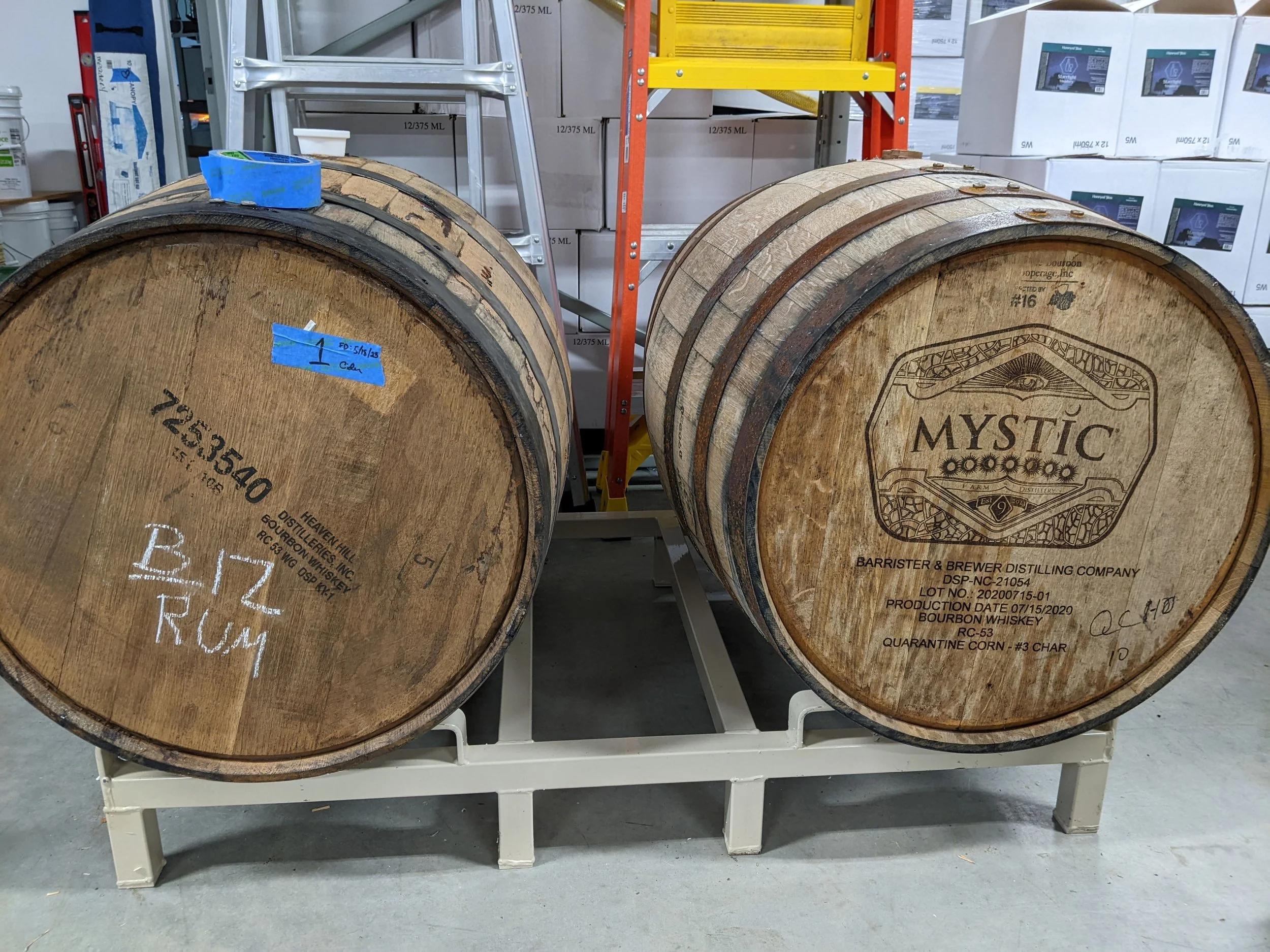 Rum barrel from Fair Game Beverage with Hwy 64 and a whisky barrel from Mystic Distillery with mead in it.